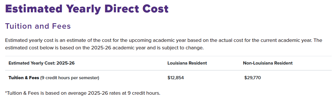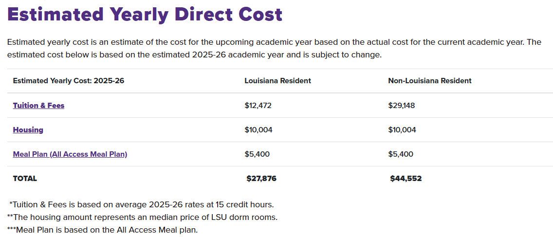 Một điểm mạnh khác của LSU là quy mô lớn nhưng chi phí hợp lý so với nhiều đại học nghiên cứu khác tại Mỹ. Điều này khiến LSU trở thành lựa chọn phù hợp cho sinh viên quốc tế mong muốn theo đuổi chương trình đào tạo chất lượng cao trong khi vẫn kiểm soát được ngân sách du học.